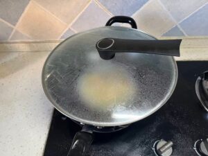 3. 晃动锅,让油均匀涂在要煎制的位置