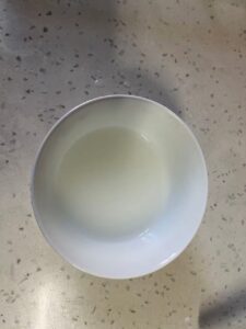 将速冻睡觉从冰箱里拿出来放在一旁,找一支空碗开始制作生粉糊,水和生粉的比例要是10:1,水量控制在刚好到没过水饺一半的位置。